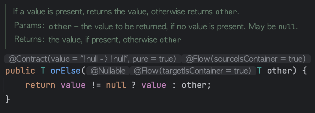 메서드 구현을 보면, 값이 null이 아니면 값을 반환하고, 아니라면 매개변수를 반환한다.